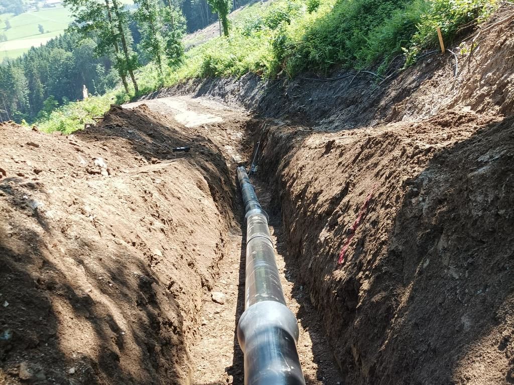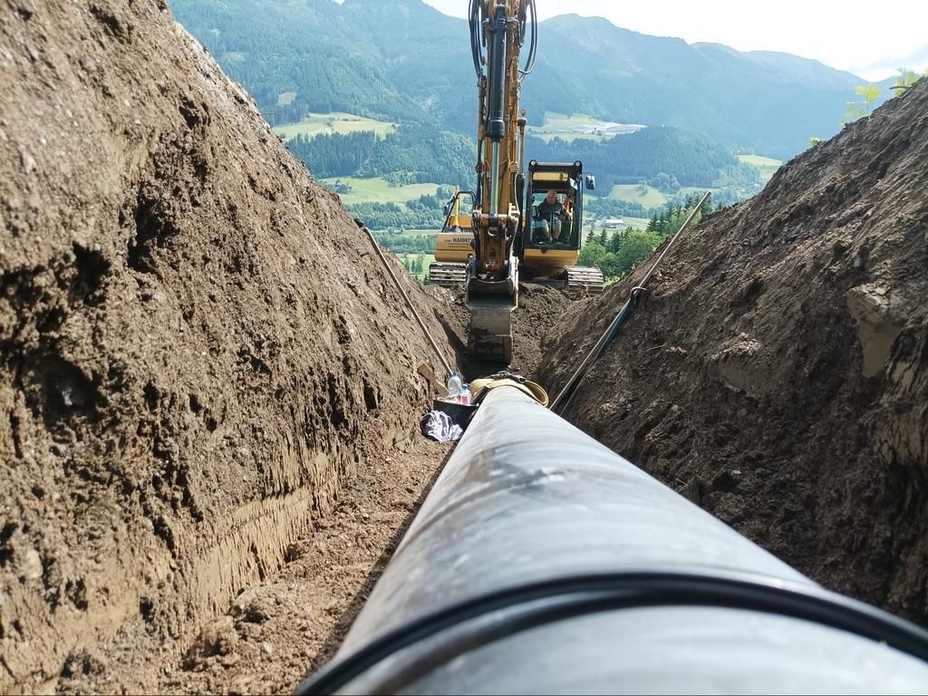 Errichtung der Druckrohrleitung über rund 1.570 lfm aus zug- und schubfesten Gussrohren DN300, bei Geländeneigungen bis zu 38°, inklusive Verlegung der Steuerkabel
